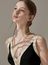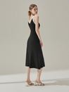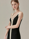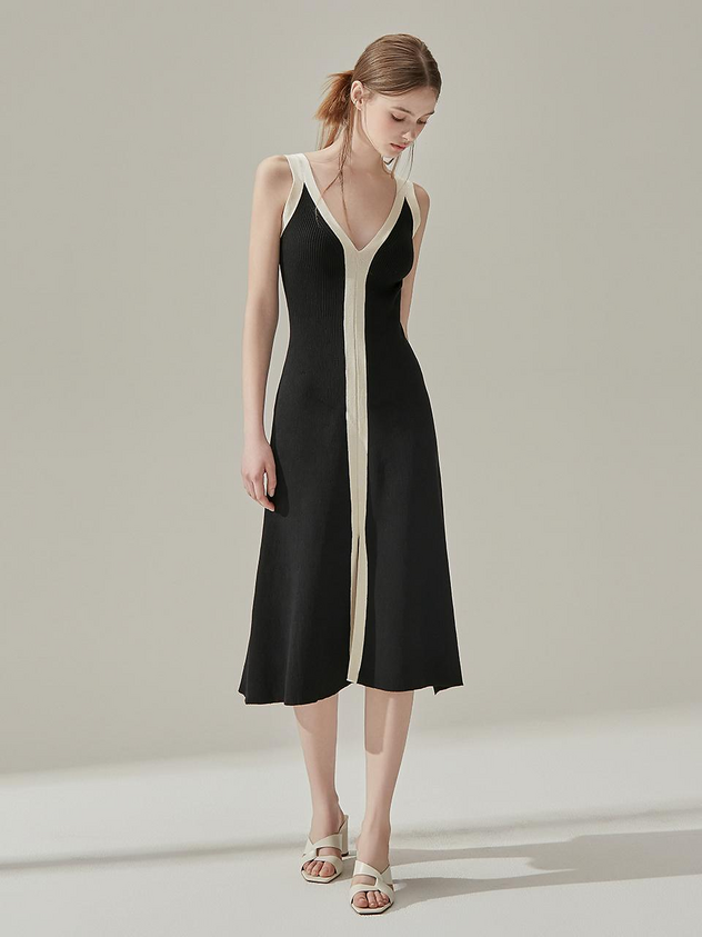 This sophisticated color-block knit dress combines cream beige and black in a figure-flattering design with a V-neckline and front slit detail. The luxurious ribbed knit fabric, made from a polyester-rayon-spandex blend, offers exceptional elasticity for a comfortable, body-hugging fit that adapts to various body types. Perfect for both daily wear and travel, this wrinkle-resistant piece features a central vertical line that creates a slimming effect while maintaining an elegant, timeless appeal.