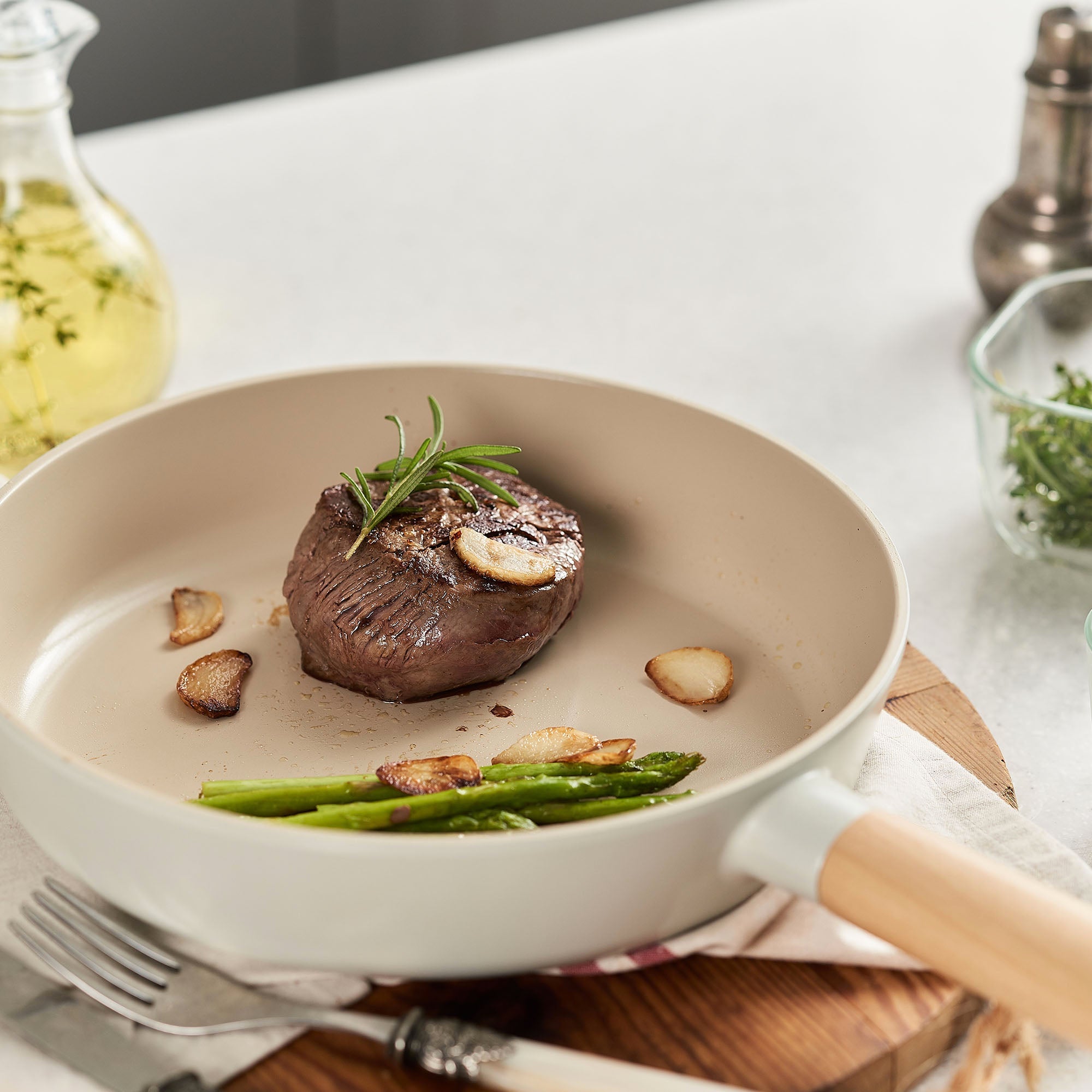 Award-Winning Design: Scandinavian-inspired with simple round contours, matte off-white exterior, glossy sand-colored interior, and wooden handles. Silicone rimmed glass lid for precise and quiet closure.