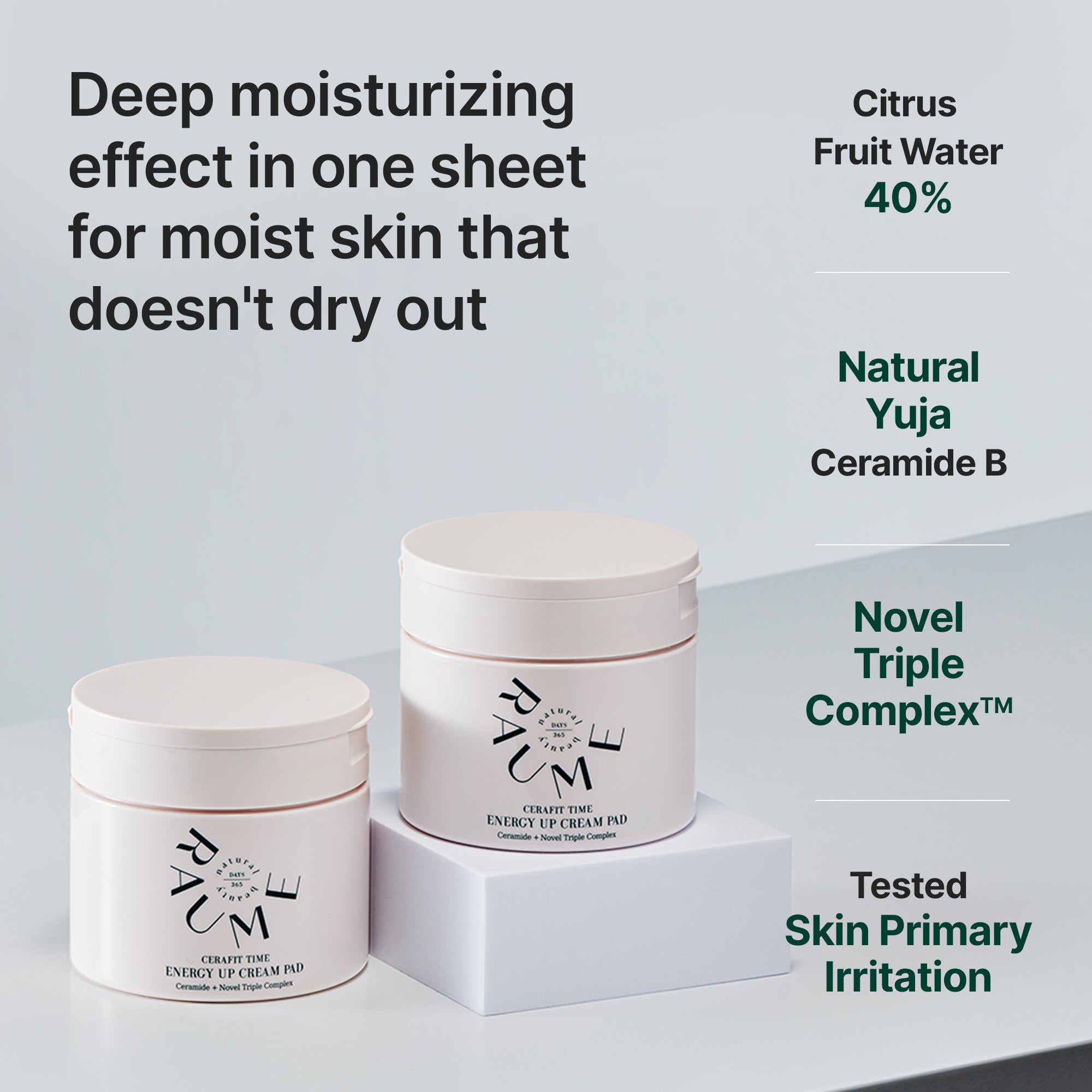 RAUME Cerafit Time Energy Up Cream Pad provides a deep moisturizing effect in one shot with its high-density cream essence formula.