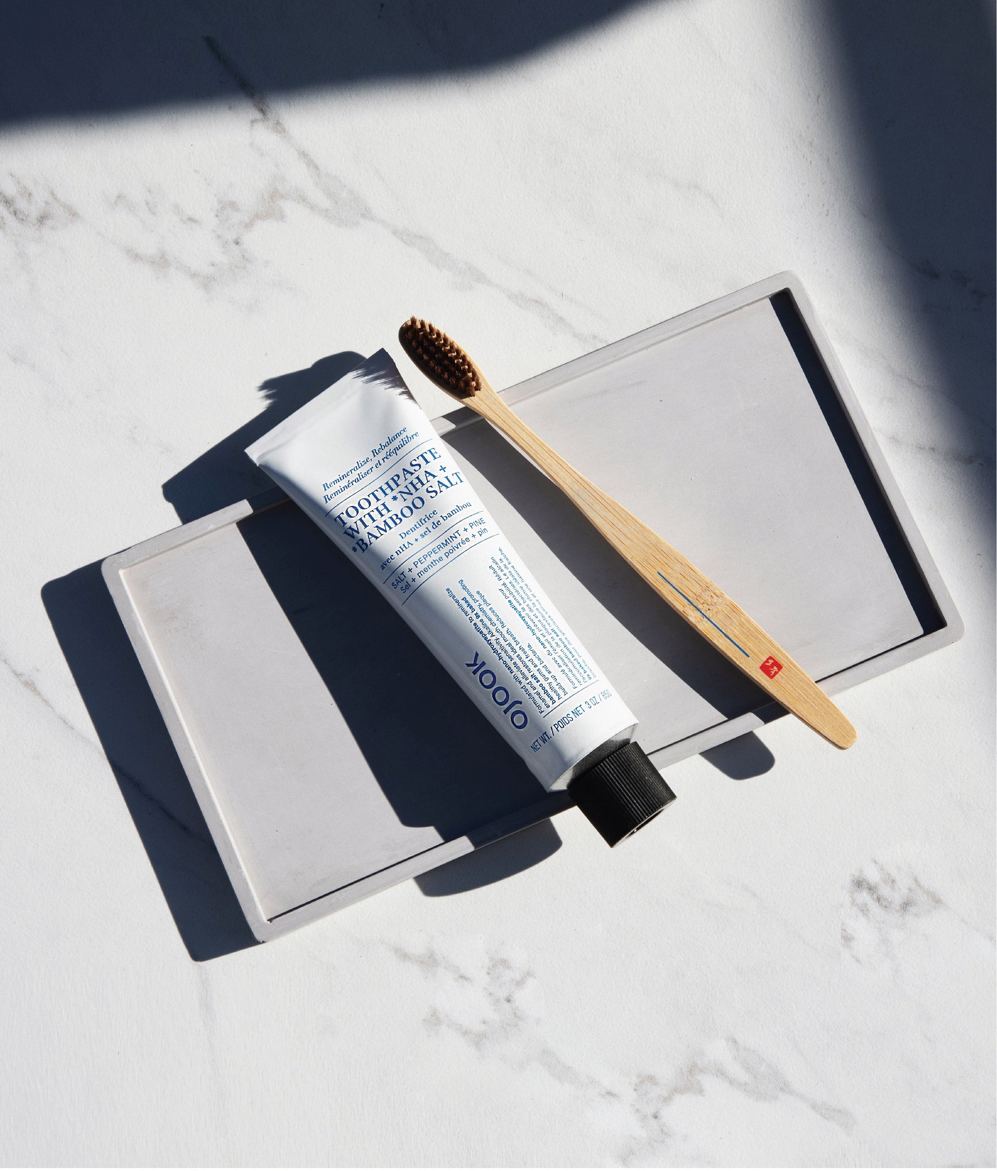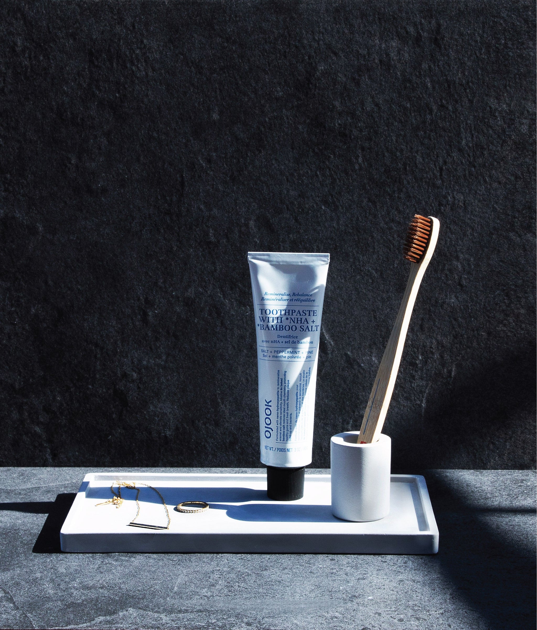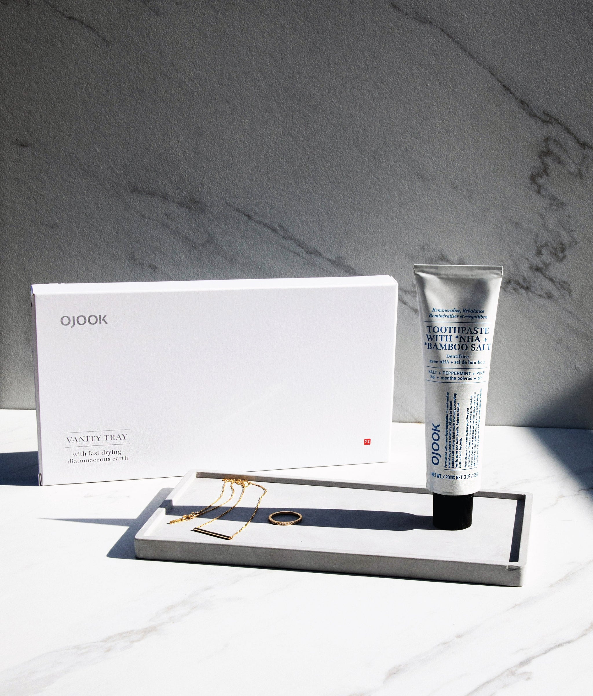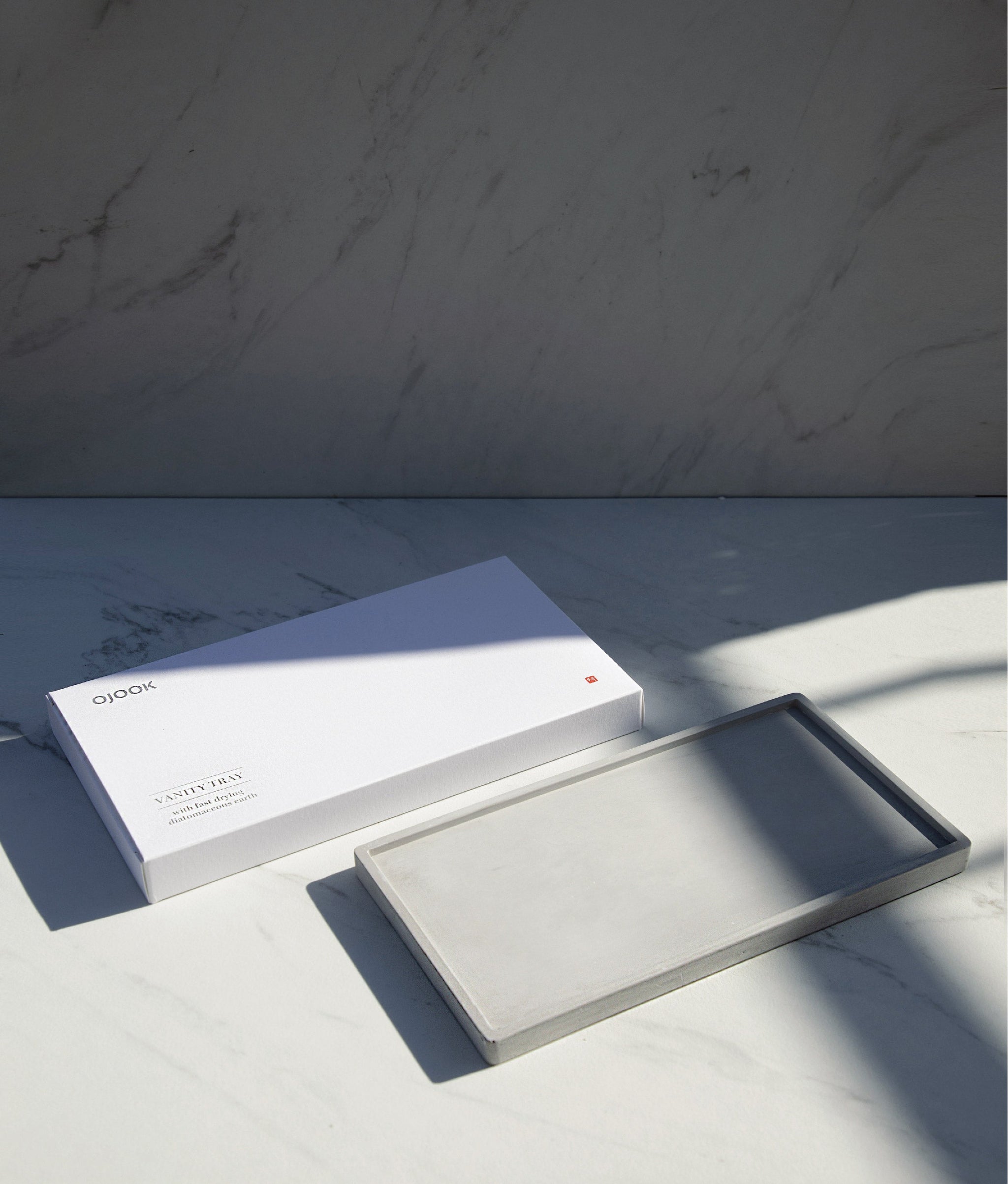 OJOOK Vanity Tray is a minimal bathroom accessory designed to keep your vanity clutter-free and beautifully organized. Made from diatomaceous earth, a compostable raw material made of the fossilized remains of algae, the tray is fast-drying and mold-resistant.
