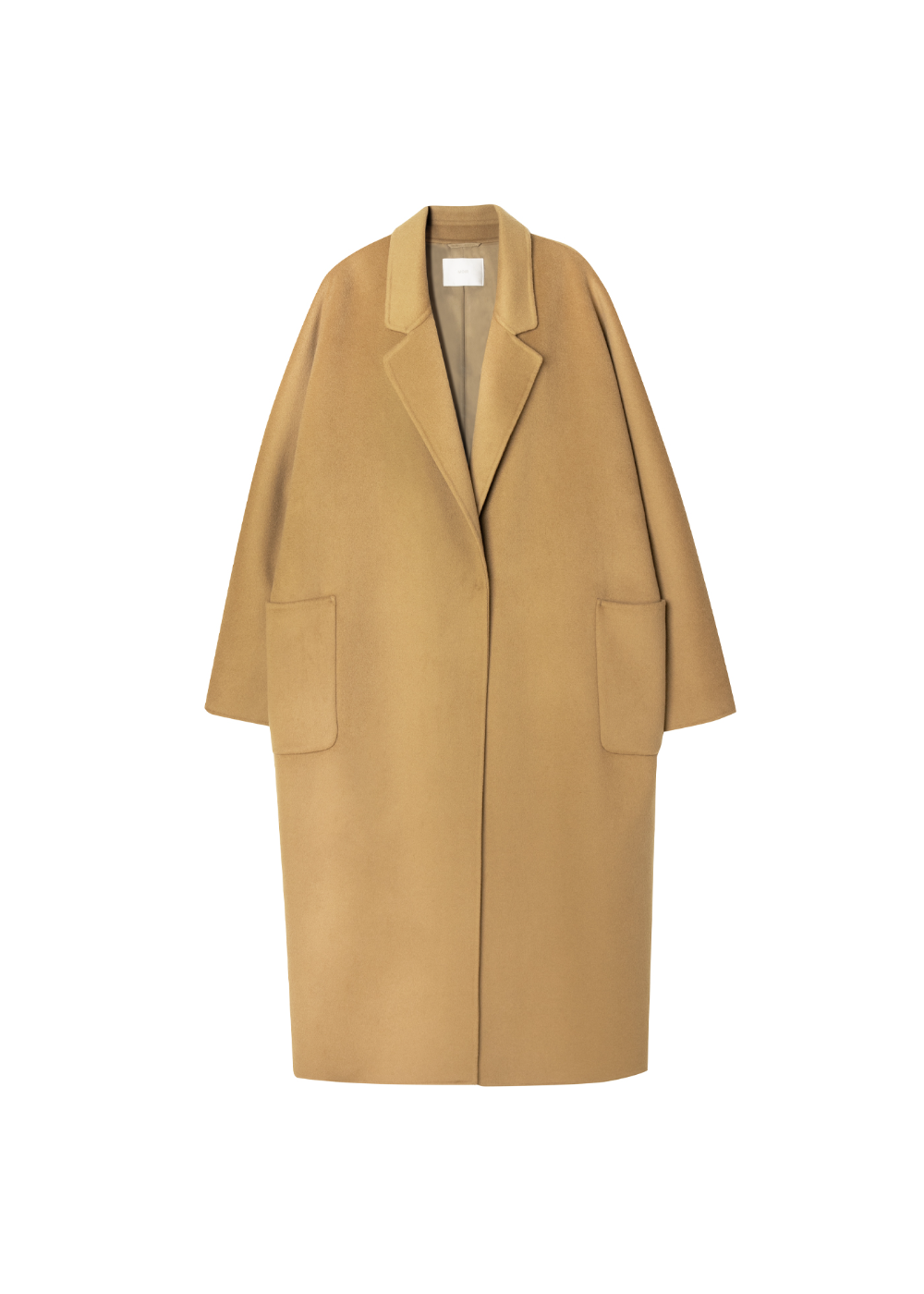 The relaxed, oversized fit, simple tailored lapels, and single hidden button closure evoke both modern and classic charm. The dolman sleeve design naturally drops from the shoulders, accentuating soft curves and creating a sophisticated silhouette. The coat creates a flexible yet three-dimensional silhouette when worn. A deep back slit allows for movement, and a three-dimensional outer pocket adds practicality.