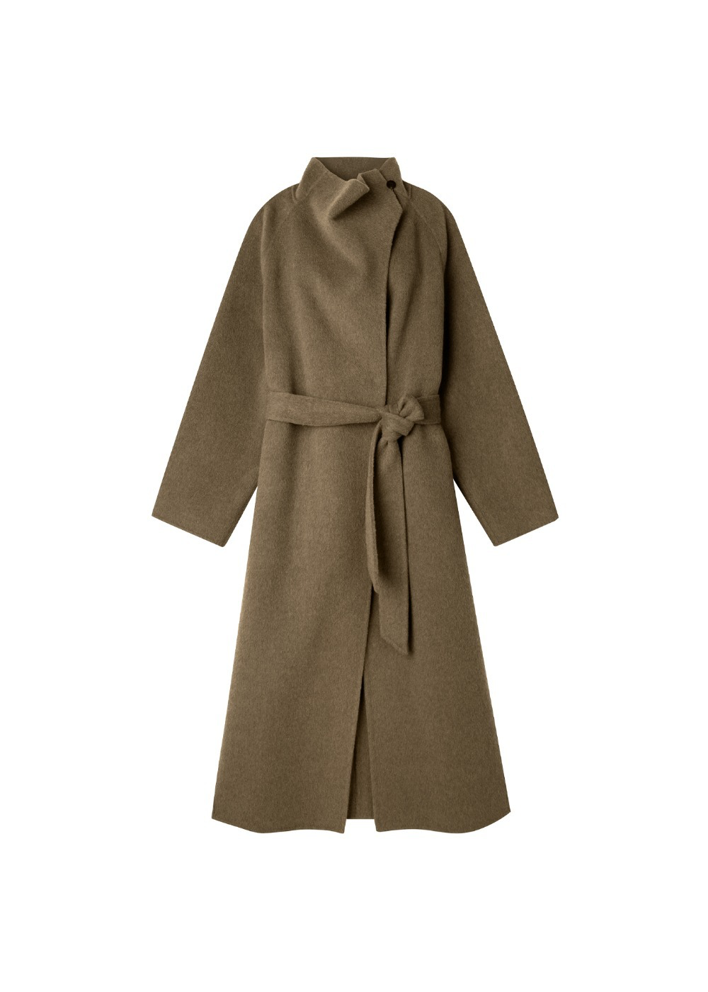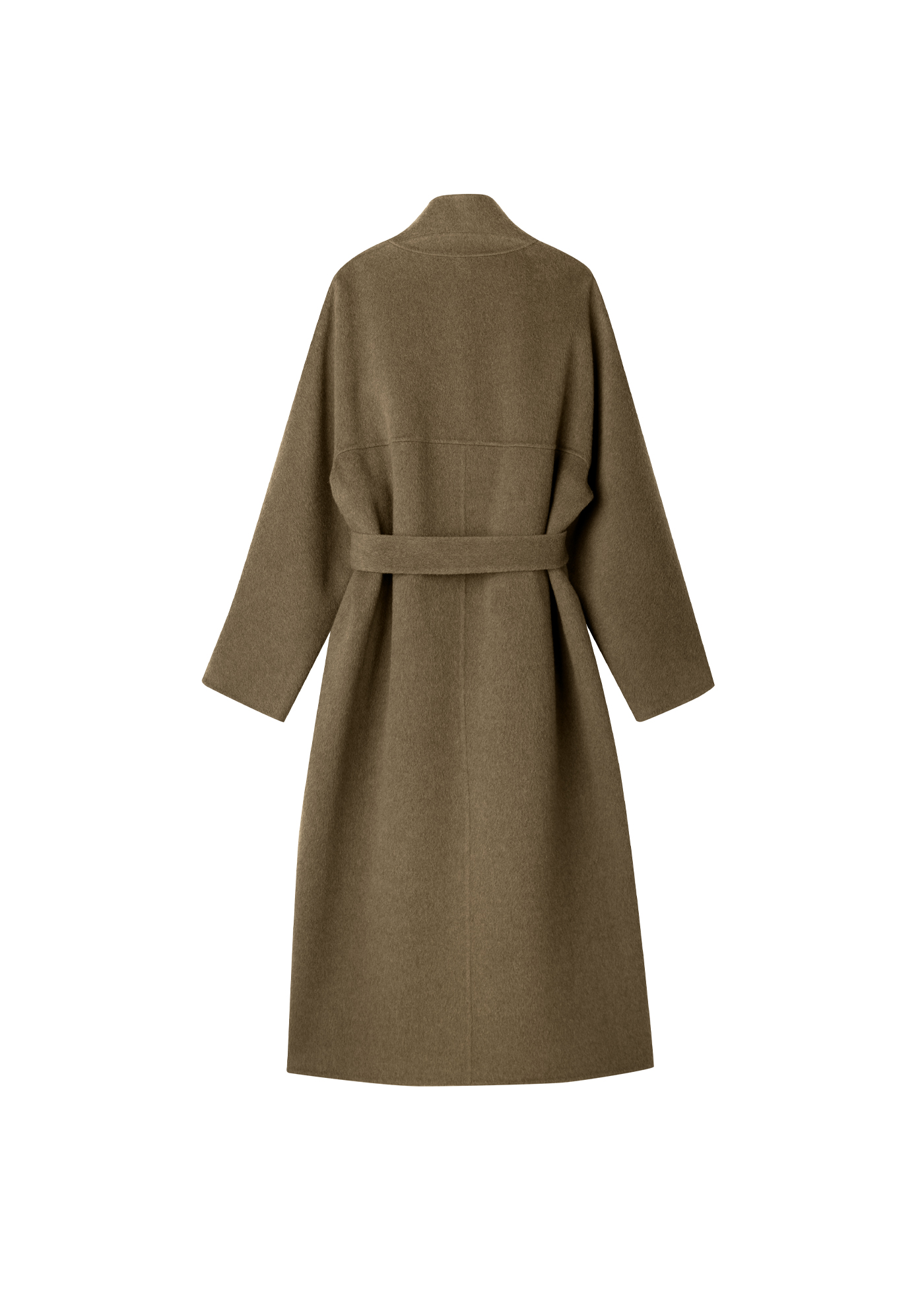 The high-neck design fastens with luxurious horn buttons and, with its design warmly hugging the neckline, can be styled naturally open for a stylish look. The loose-fitting silhouette features raglan sleeves and double hidden button closures for a comfortable fit. Side seam pockets add practicality. An included belt in the same fabric allows for versatile styling.