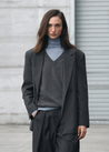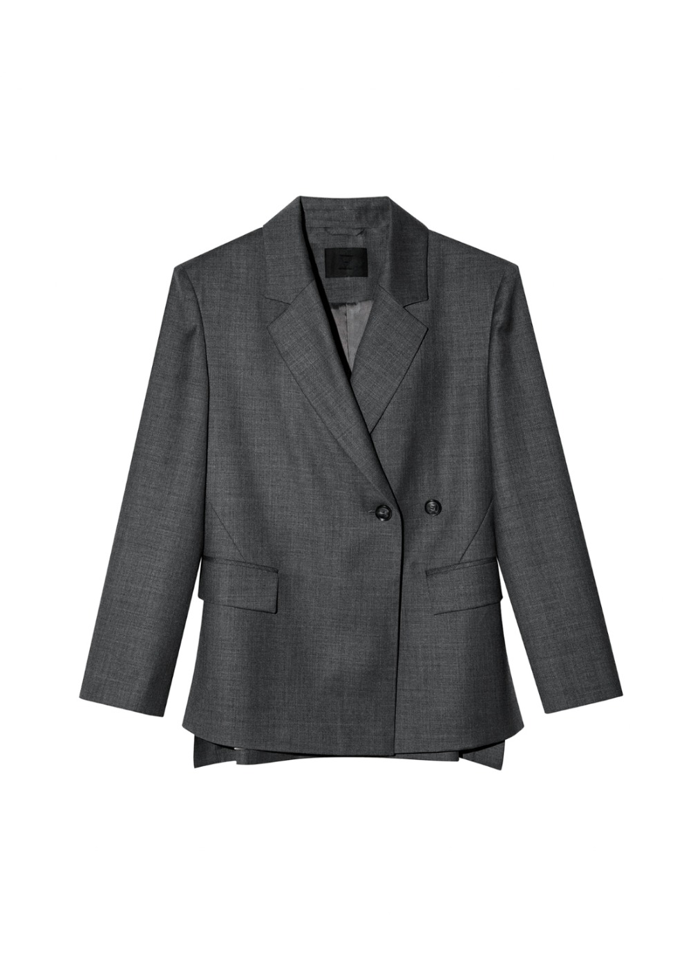 The oversized silhouette, hip-hugging length, classic notched lapels, and minimal double-button detailing create a sophisticated mood, allowing for two styles: an oversized fit and a waist-emphasizing style. Shoulder pads naturally define the silhouette, creating a structured look. Sleeve slits, side slits, and back slits ensure a comfortable fit. The waistline and shoulder fit, meticulously crafted from the armholes, create a refined atmosphere within the relaxed silhouette. Flap pockets on both sides add practicality. Crafted