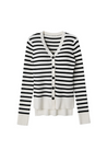 The moderately plunging V-neck and slim fit create a delicate look, while the black and ivory striped pattern offers a modern yet classic vibe. The unbalanced hem design, with a longer back length, features side slits at the hem for a comfortable fit, and the contrasting front buttons and ribbed finish create a clean silhouette.