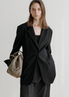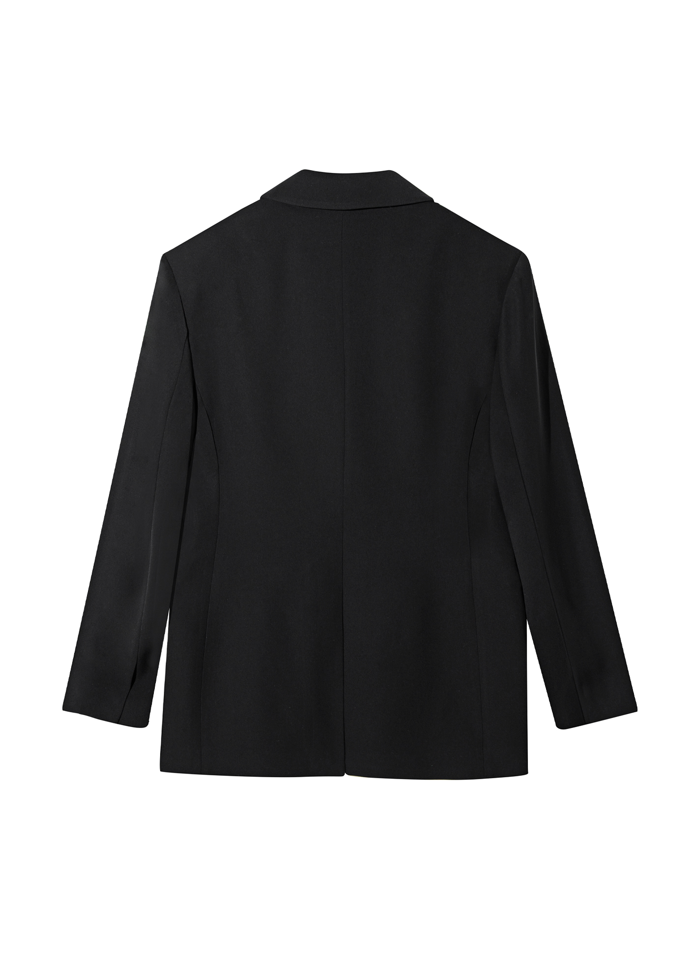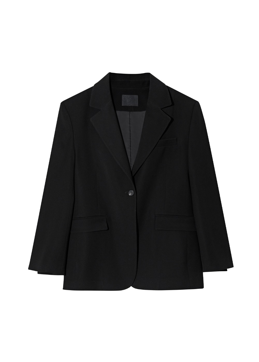 loose yet slim silhouette, hip-hugging length, and built-in shoulder pads create a naturally oversized look, creating a chic and sophisticated silhouette. Classic notched lapels and a one-button single-breasted front create a sophisticated look, while flap pockets on both sides enhance practicality and completeness. Deep double slits at the cuffs and a center back slit add minimal detail and freedom of movement.