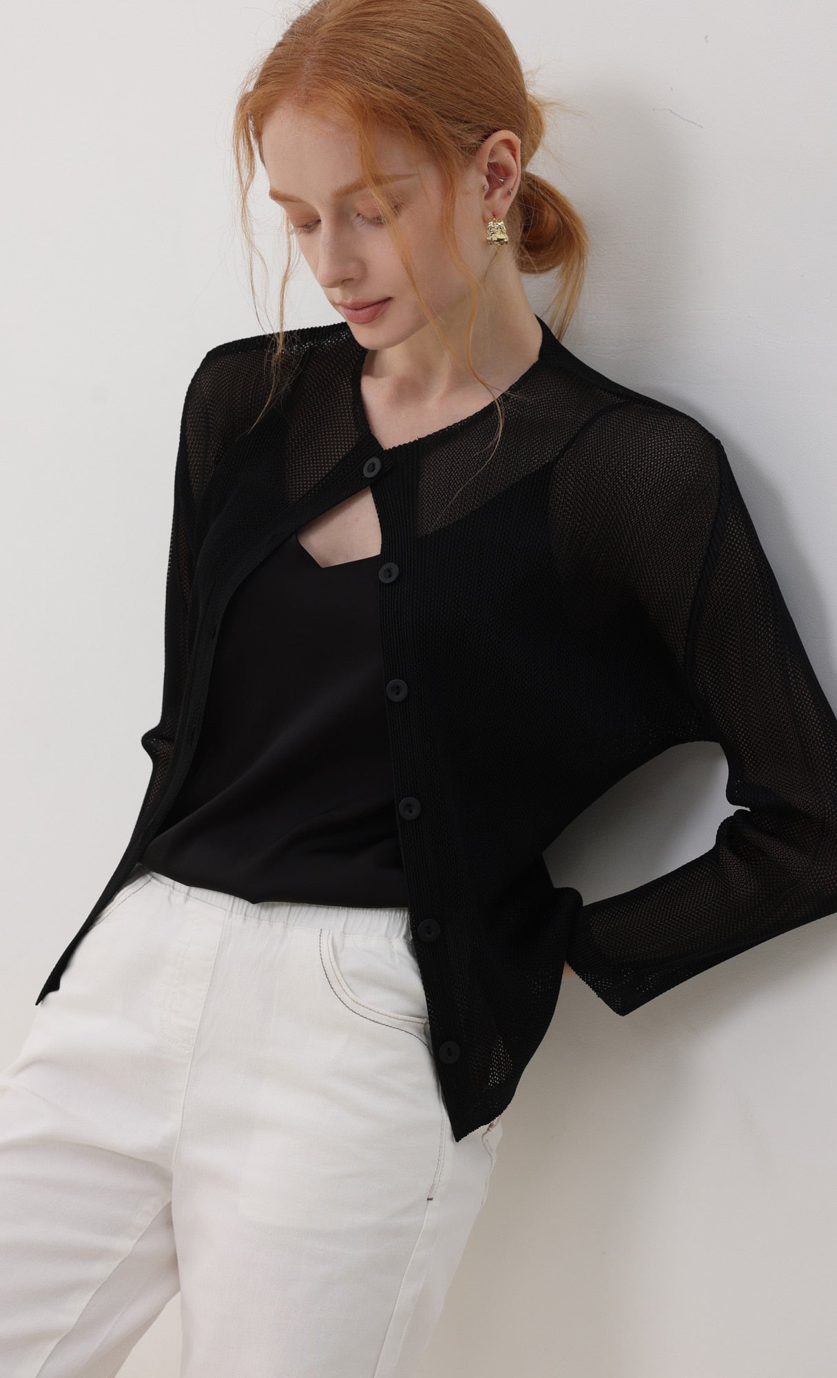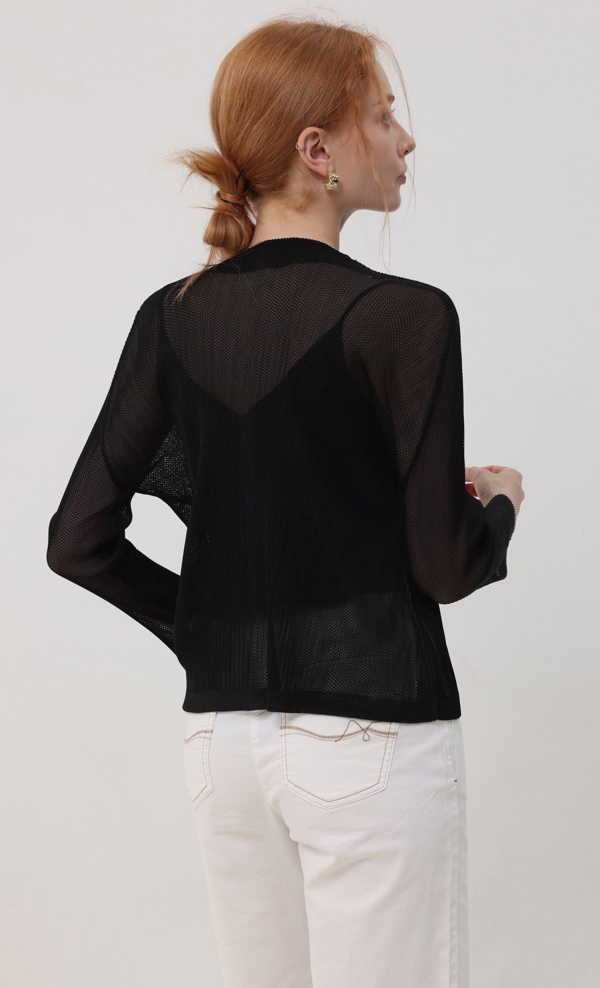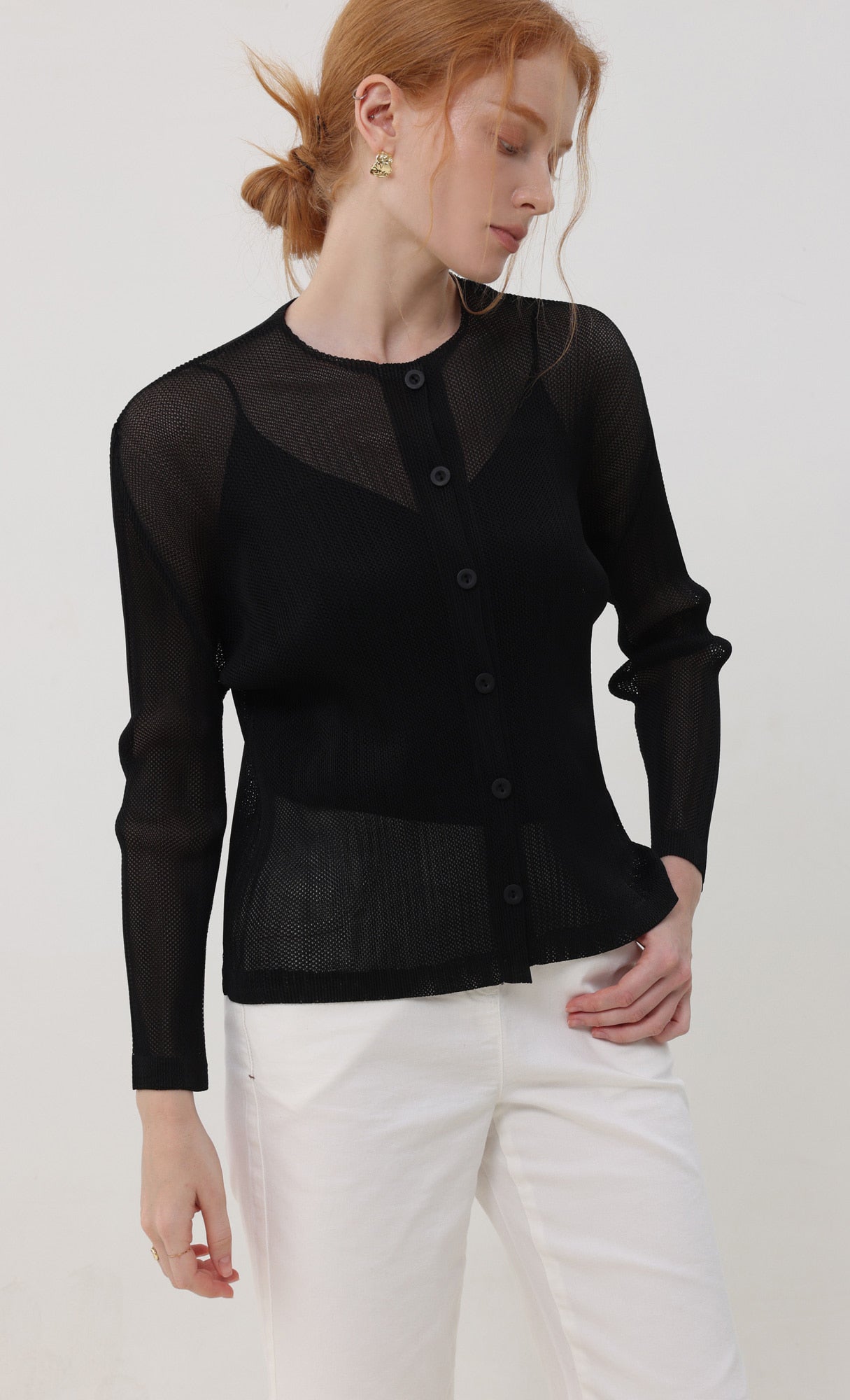 The Sheer Pleats Cardigan is a delicate layering piece from Pleats Please Issey Miyake that blends transparency with sculptural elegance. Its semi-sheer pleated fabric drapes fluidly, creating a lightweight, artistic silhouette that enhances any outfit with modern sophistication.